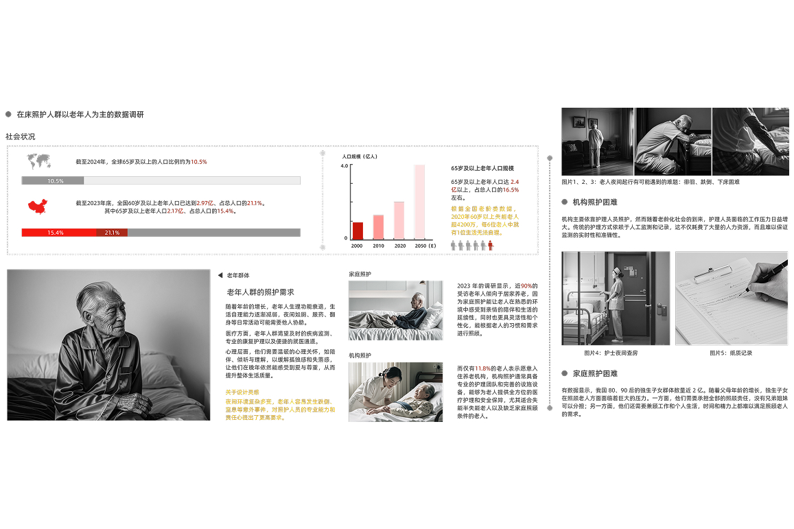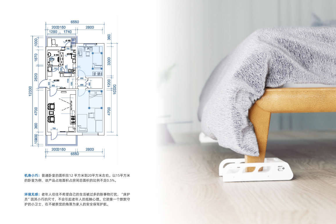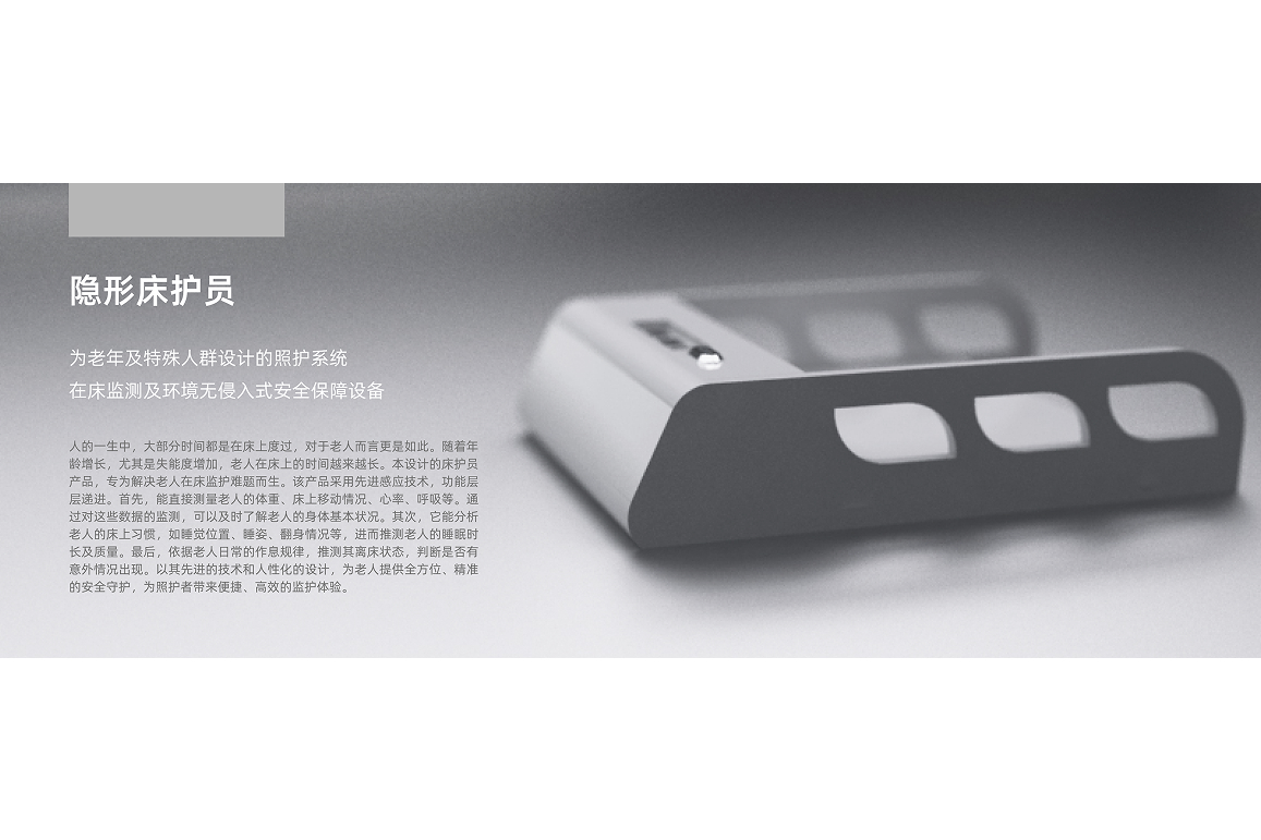 The Invisible BedGuard is designed for elderly users, utilizing flexible sensing technology to continuously monitor (weight, heart rate, respiration) and behavioral data (movement patterns, sleep postures, turning frequency). It intelligently analyzes sleep quality and daily routines to detect abnormal bed-exiting states. With its furniture-integrated design (bed-foot style), the product blends seamlessly into bedroom environments, eliminating the "being monitored" psychological burden while providing caregivers with multidimensional data insights like fall risk alerts and health trend analysis. This discreet monitoring system achieves a balance between unobtrusive supervision and humanized care.