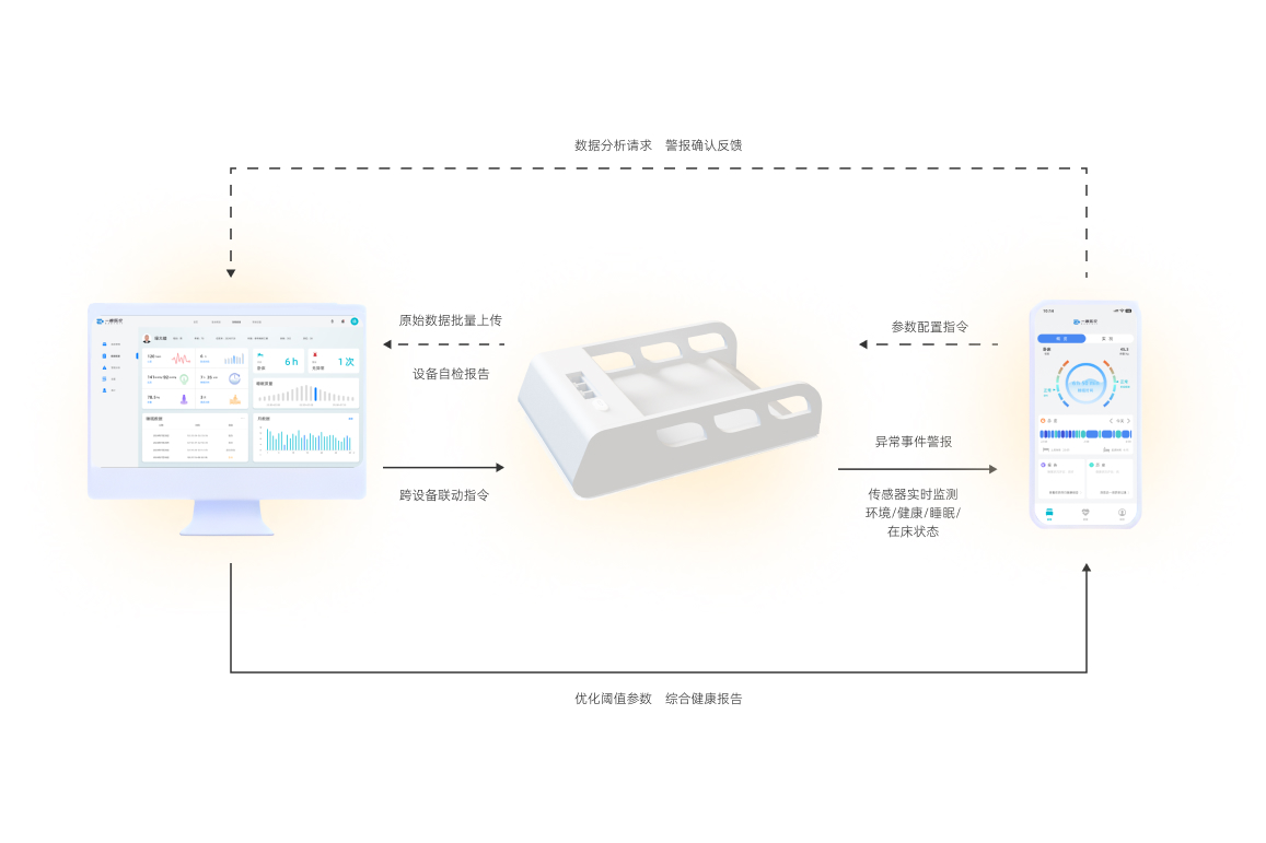 隐形床护员专为老龄用户设计,通过柔性传感技术全天候监测卧床体征(体重、心率、呼吸)及行为数据(移动轨迹、睡姿、翻身频率),智能分析睡眠质量与作息规律,精准识别离床异常状态。产品以家居化形态(床脚式)融入卧室环境,既避免"被监视"心理负担,又能通过多维度数据为照护者提供跌倒预警、健康趋势研判等智能守护,实现隐蔽监护与人性化关怀的平衡。