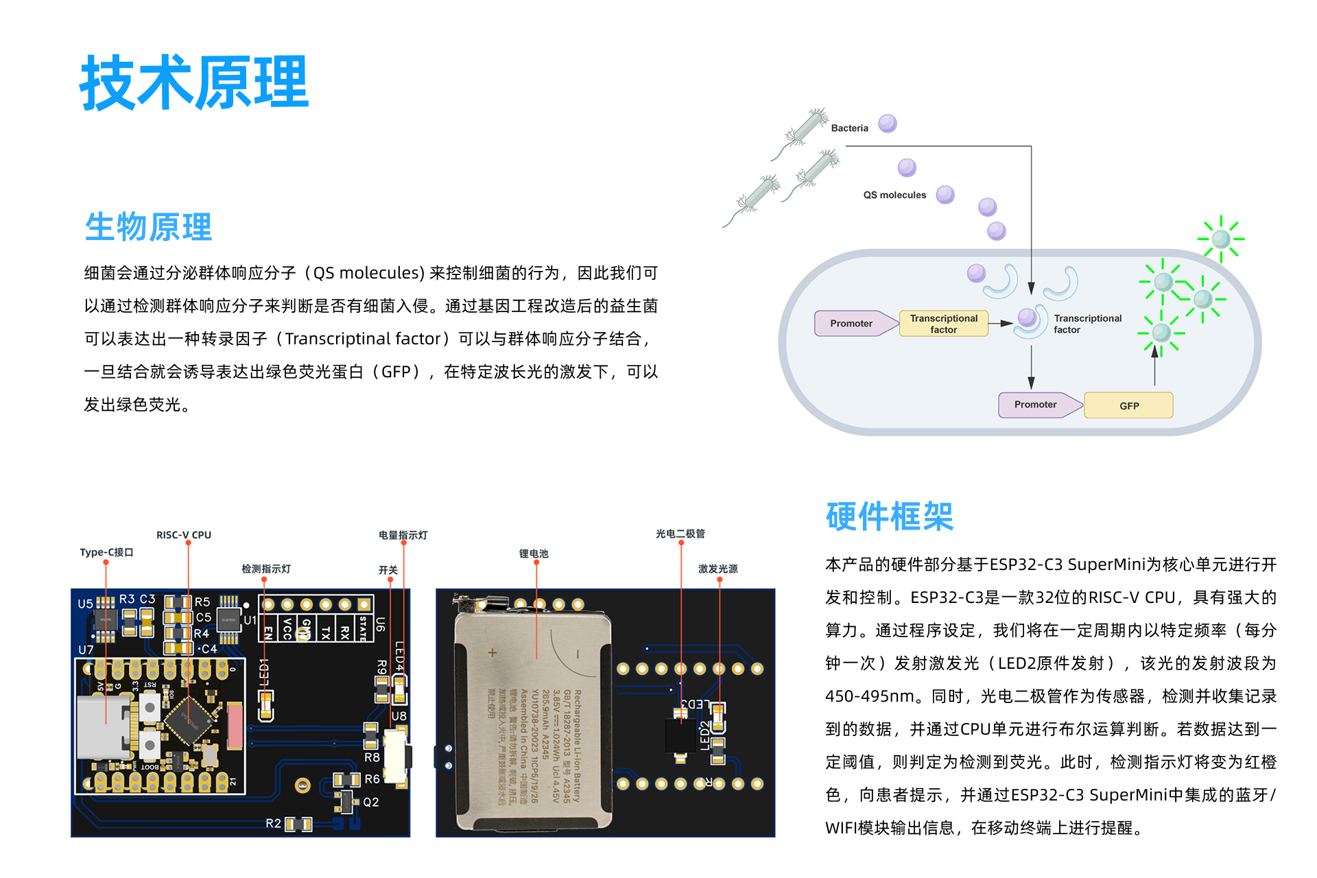 This product is a wearable bacterial infection detection patch designed based on the Kano model, integrating technologies from bioengineering and electronic engineering. It enables real-time, non-invasive monitoring of bacterial secretions through fluorescence signals. The device is designed with a strong focus on user needs—featuring a modular, lightweight, and comfortable structure—while also supporting data transmission to enhance early postoperative infection detection, facilitate precise clinical treatment, and enable intelligent health management.