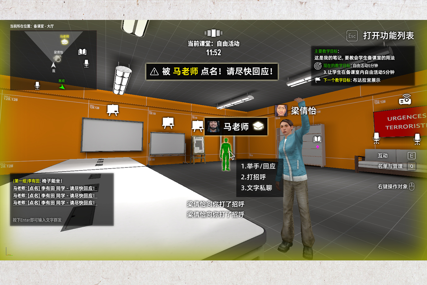 A virtual teaching platform designed based on theory of participatory teaching. To avoid thresholds in use, it adapts Source instead of Unreal, making it fully compatible with computers - even using Windows XP: before everyone use, needs not everyone ray-tracing. The platform has no secondary menus, eliminates redundant functions, and avoids professional jargon and new terms to ensure user-friendliness. It differentiates functions for teachers and students, designing essential teaching functions in an elegant way.