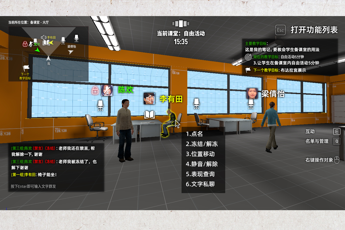 基于参与式教学思想设计的虚拟教学平台。为降低使用门槛,选用Source引擎而非Unreal,兼容XP系统电脑:在人人有得用之前,还不需要人人有光追。平台无二级菜单,精简冗余功能,避免专业术语和新词,确保用户易懂。教师和学生功能分化,以优雅的方式设计日常教学中必需的功能。