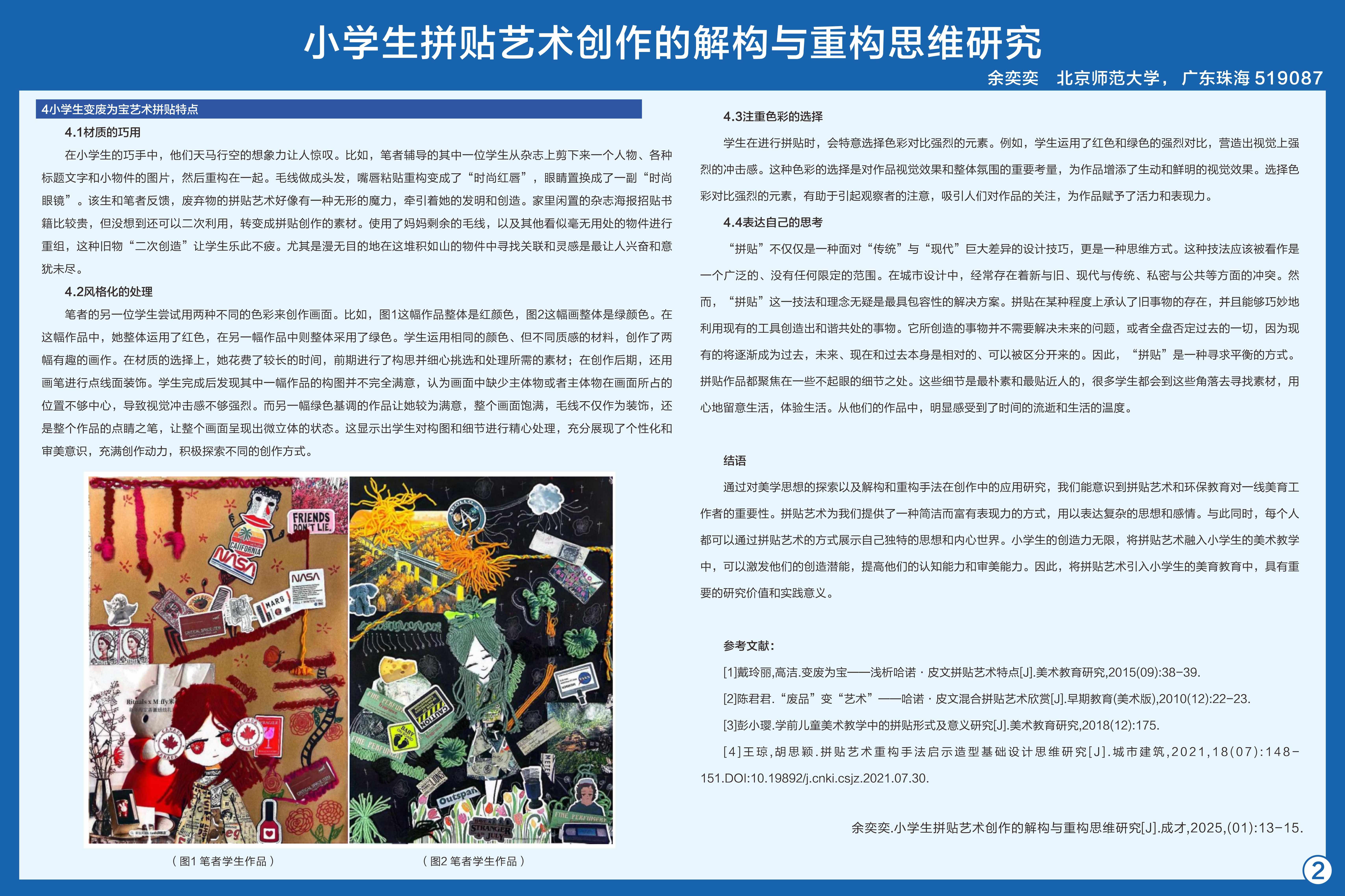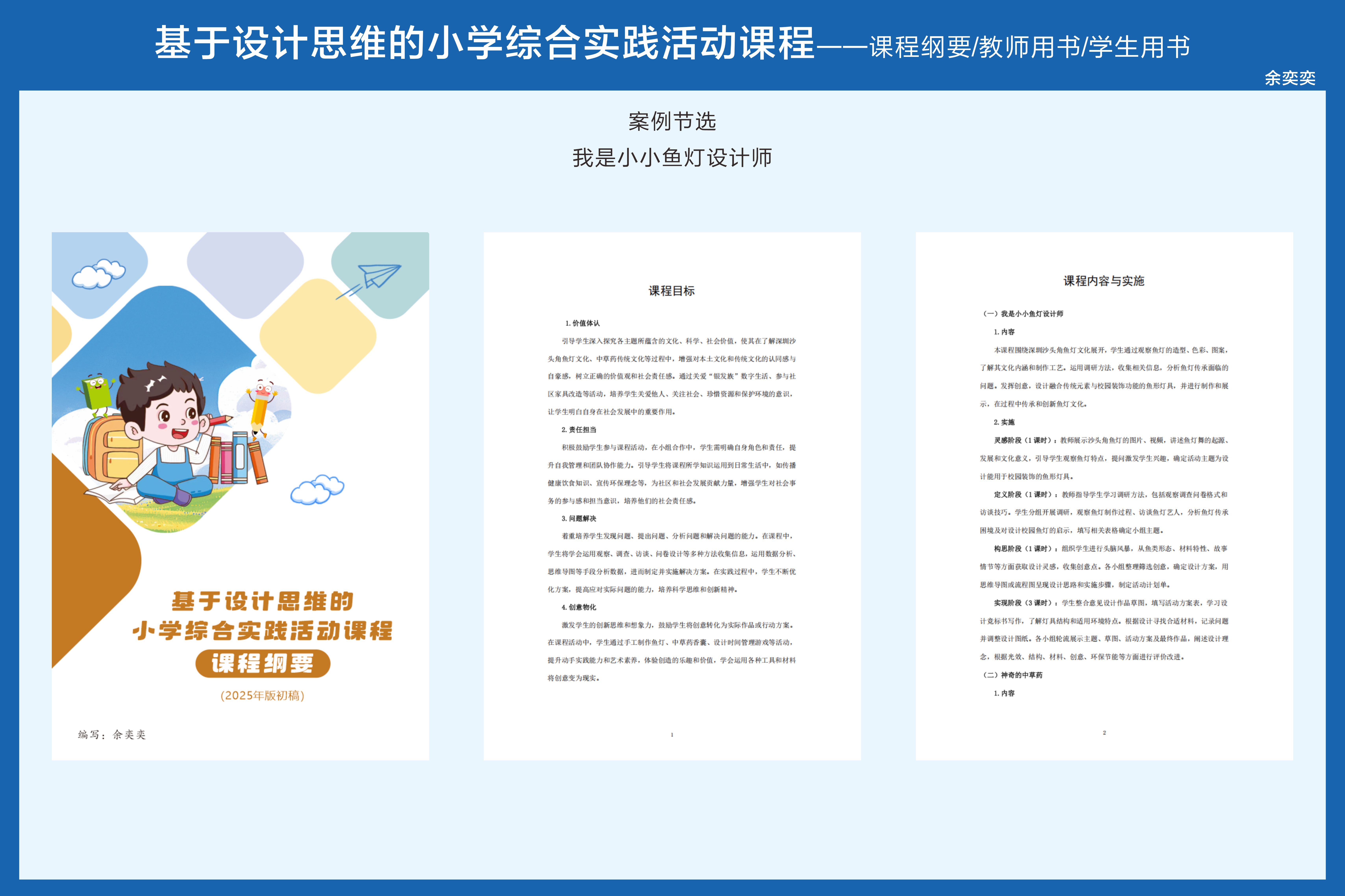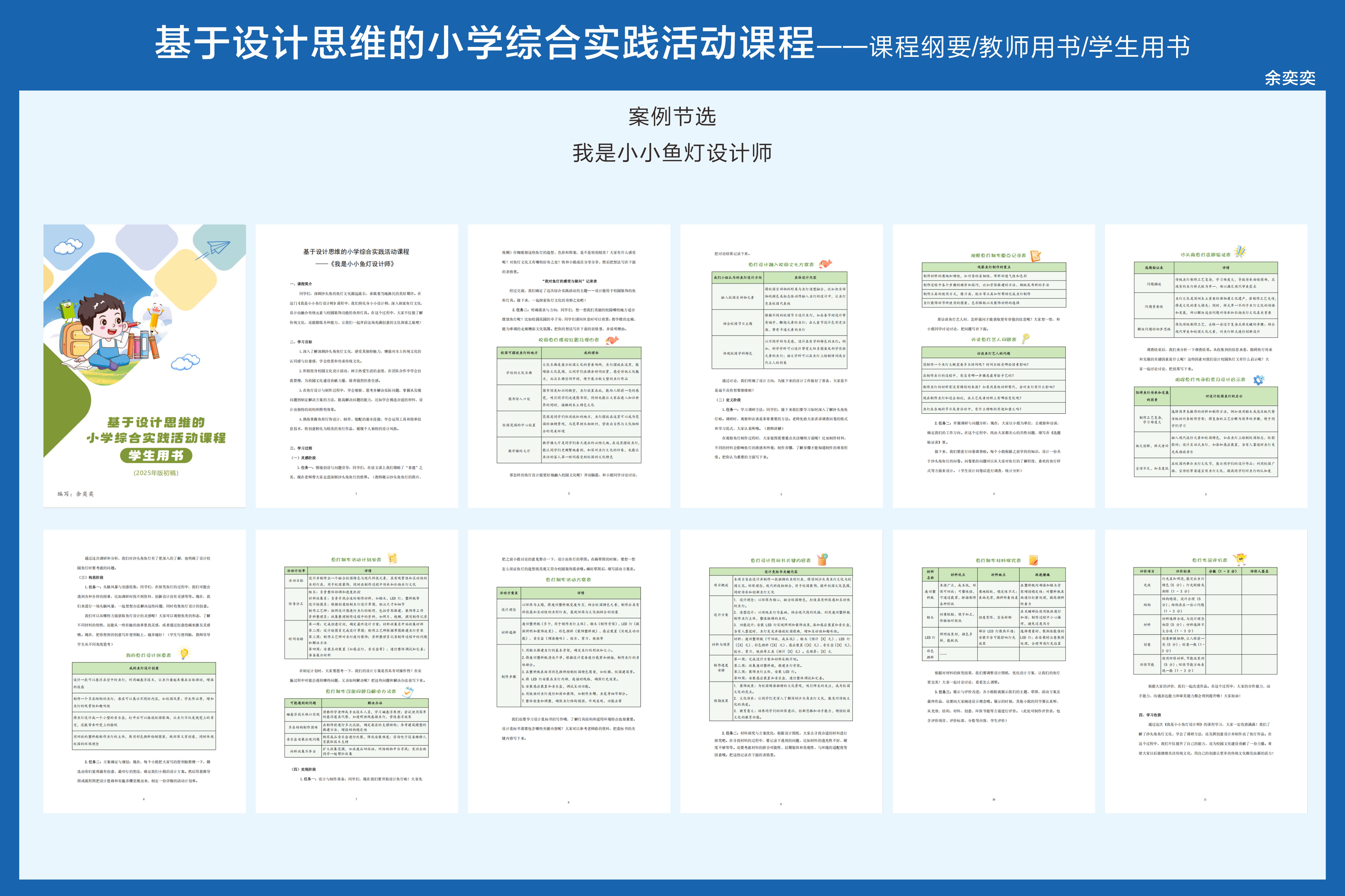 本研究构建"理论-实践-资源"三位一体成果体系:创建基于设计思维的小学综合实践活动课程模式,编制课程纲要及配套教师/学生用书,研发教具卡;录制系列微课(10讲);出版专著《小学跨学科主题教学活动设计》及教材《基于设计思维的小学综合实践活动课程设计》;两篇论文被知网收录。通过理论建构、实践工具开发与数字资源建设的协同推进,形成了完整的教学成果体系。