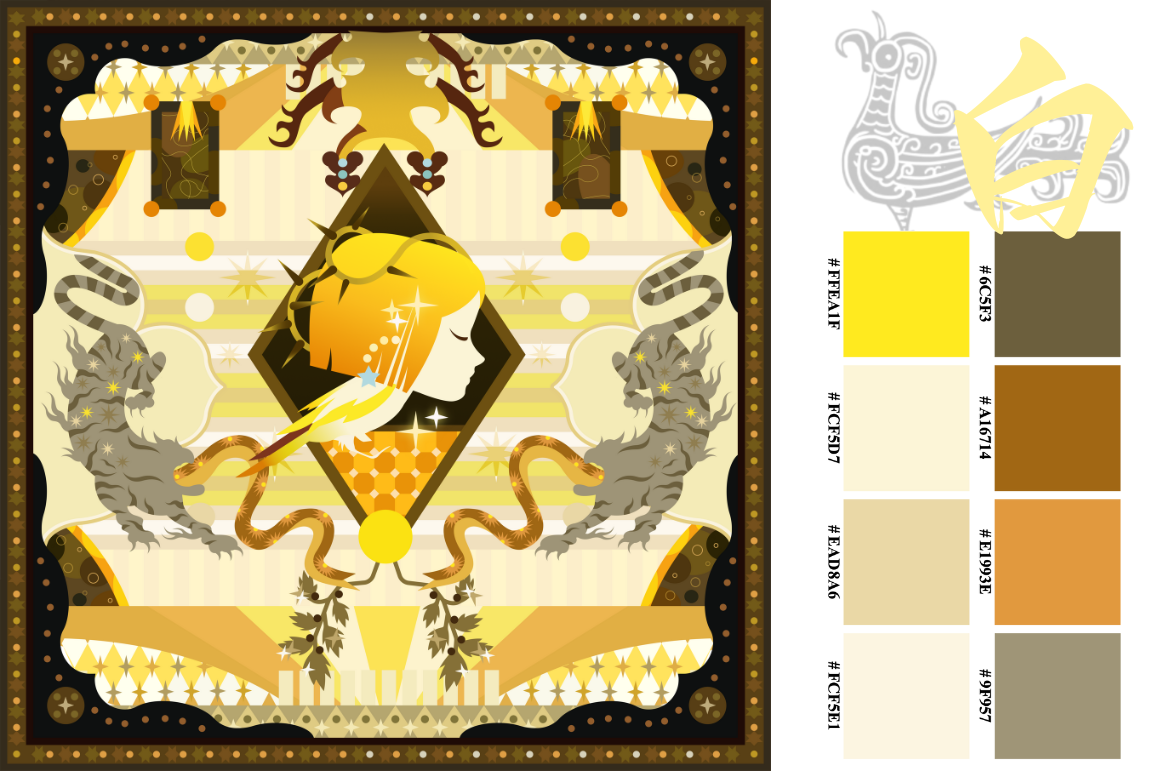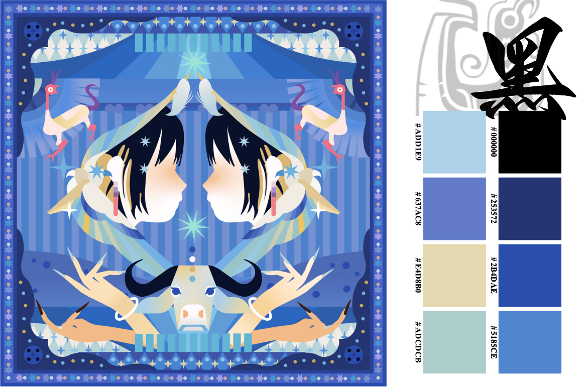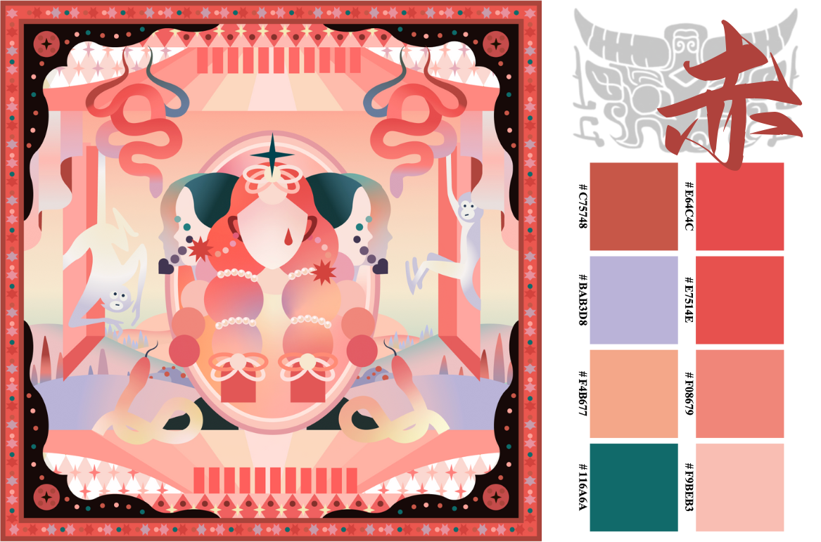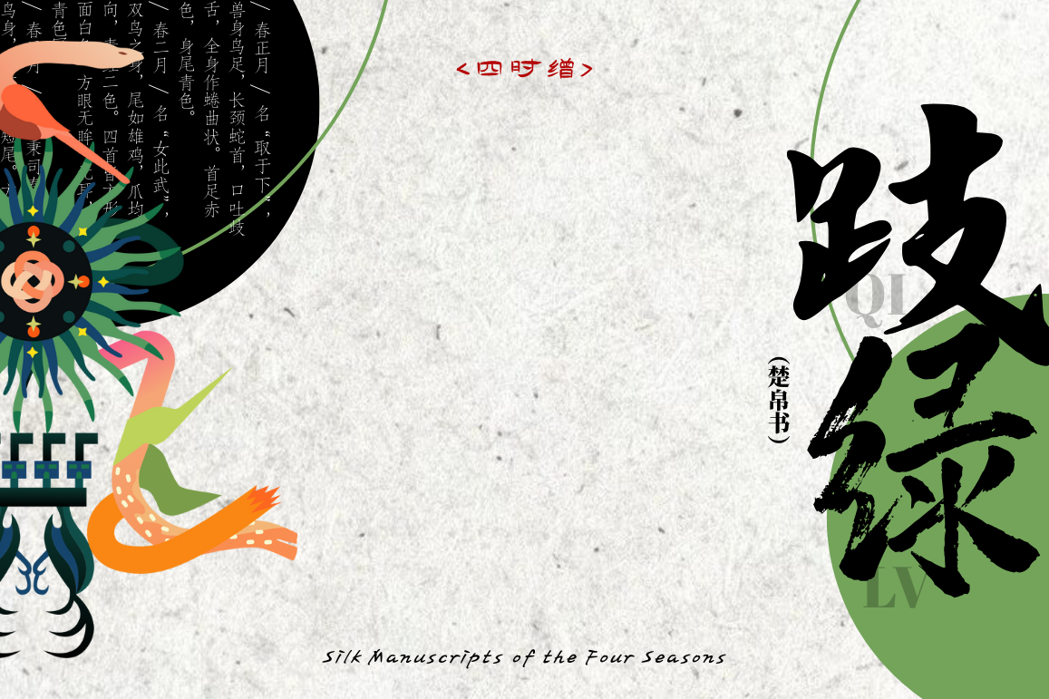 The Chu silk manuscript is the earliest silk manuscript with both pictures and texts unearthed in China so far, dating back to the Warring States Period. This work takes the twelve mysterious, strange and stylistically diverse images of the lunar gods depicted on the Chu silk manuscript as the prototype. Arranged in the order of the four seasons, by refining their modeling elements and symbolic features, the images of the twelve lunar gods are reconstructed into four composite patterns. It incorporates the natural concepts of the Chu region during the Pre-Qin period. In terms of color selection, it follows the color concept of the Chu silk manuscript, showcasing the natural worship and primitive expressions of the Chu region that the Chu silk manuscript carries.