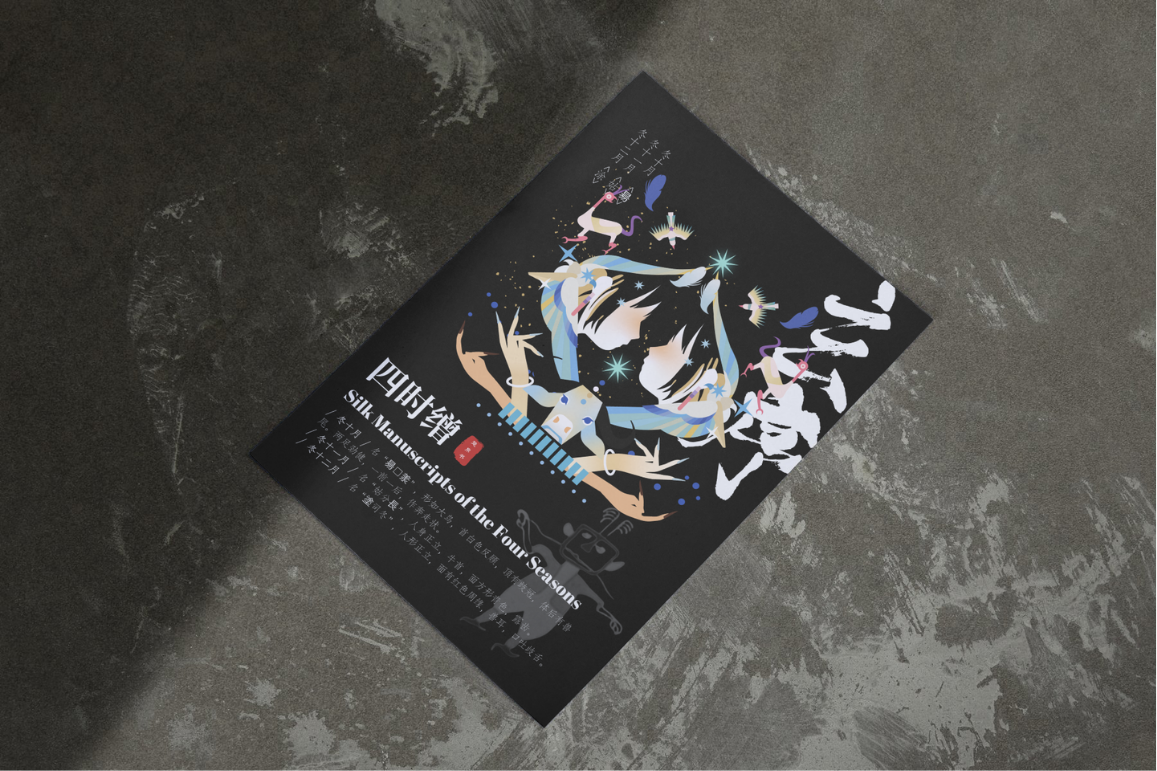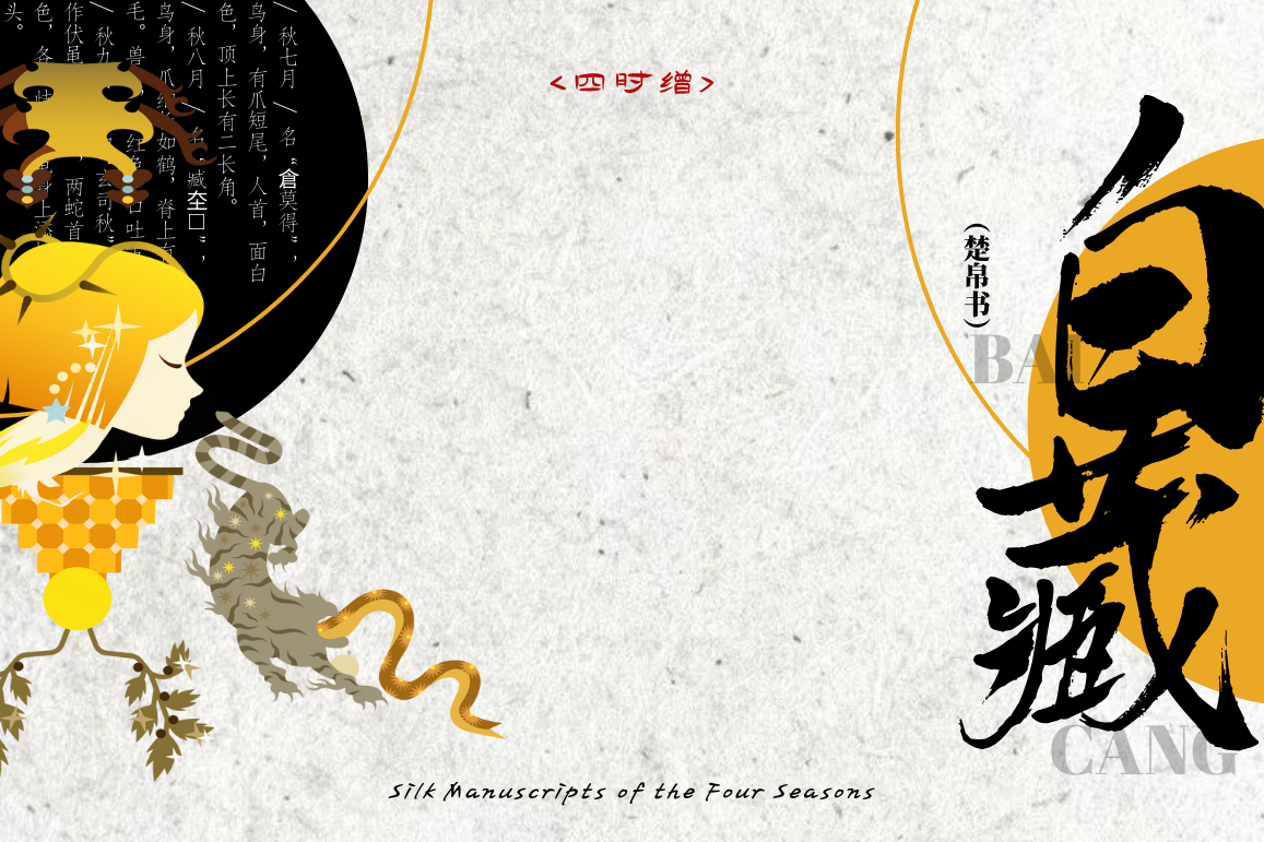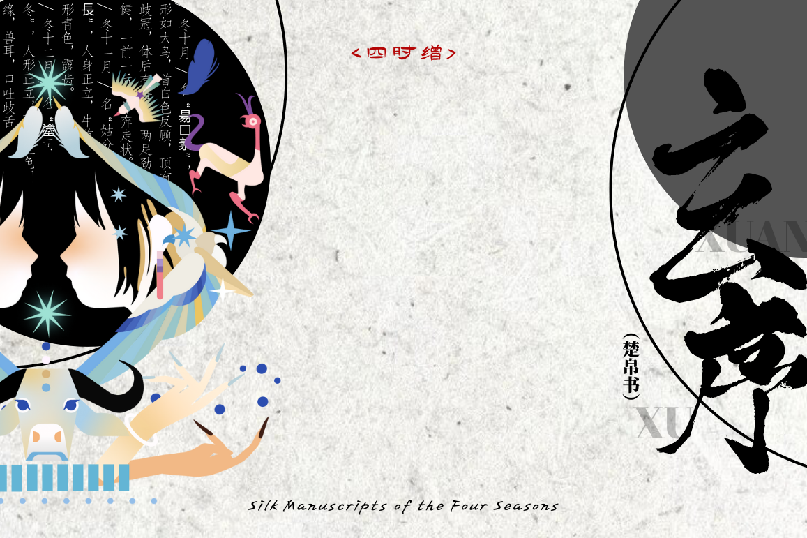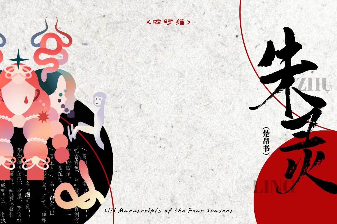 楚帛书是我国目前出土的最早的图文并茂的战国帛书,作品以楚帛书上所绘制的十二幅神秘奇诡、风格各异的月神形象为原型,以四时为序,通过提炼其造型元素和符号特征,将十二月神图像重构为四幅复合图案,融入先秦时期楚地自然观念,在色彩选择上遵循楚帛书色彩观,展现楚帛书所承载的楚地的自然崇拜与原始表达。