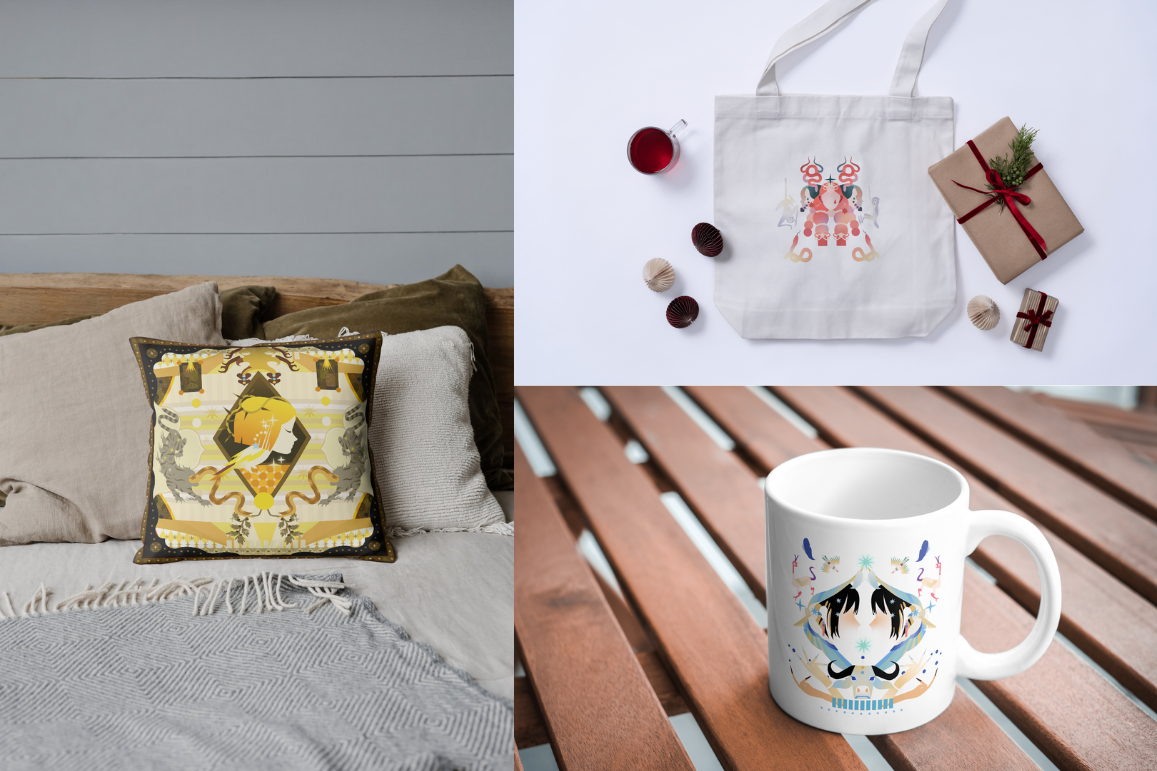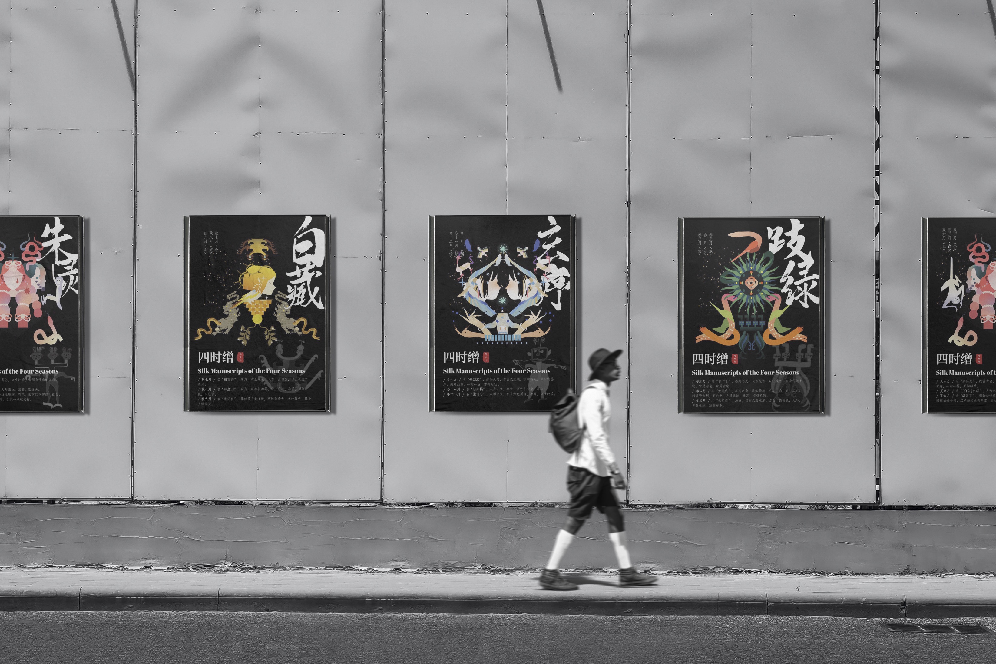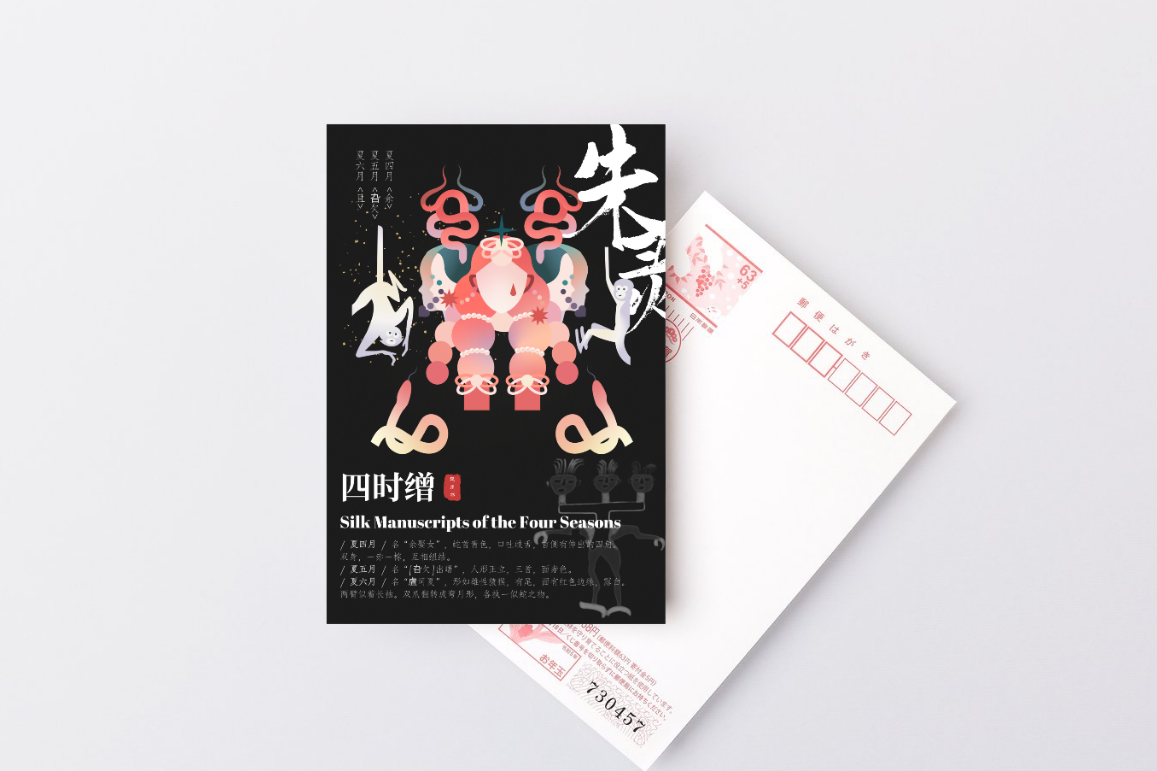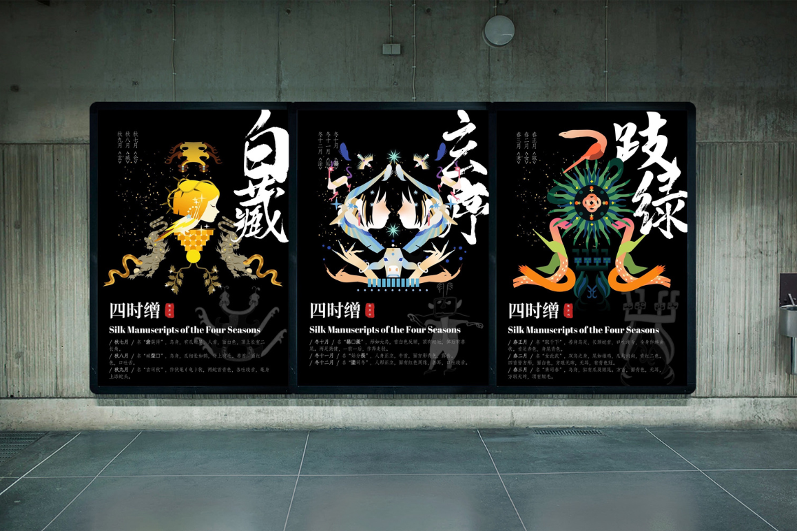 楚帛书是我国目前出土的最早的图文并茂的战国帛书,作品以楚帛书上所绘制的十二幅神秘奇诡、风格各异的月神形象为原型,以四时为序,通过提炼其造型元素和符号特征,将十二月神图像重构为四幅复合图案,融入先秦时期楚地自然观念,在色彩选择上遵循楚帛书色彩观,展现楚帛书所承载的楚地的自然崇拜与原始表达。