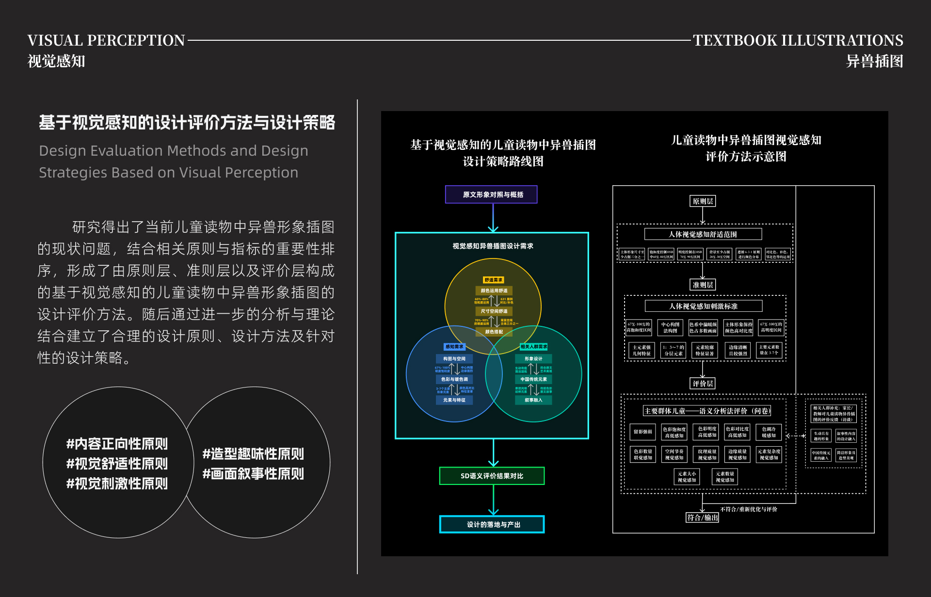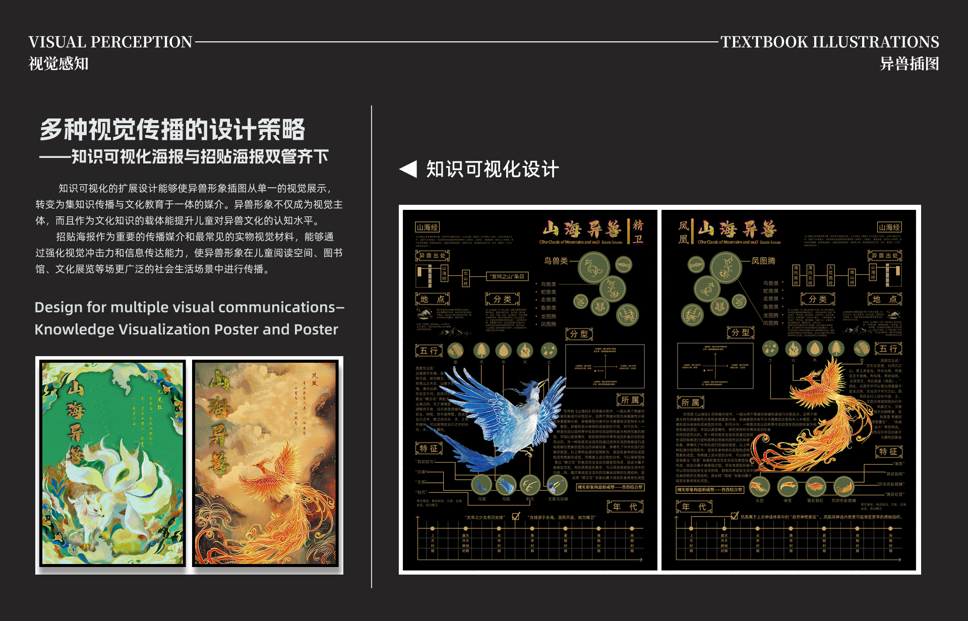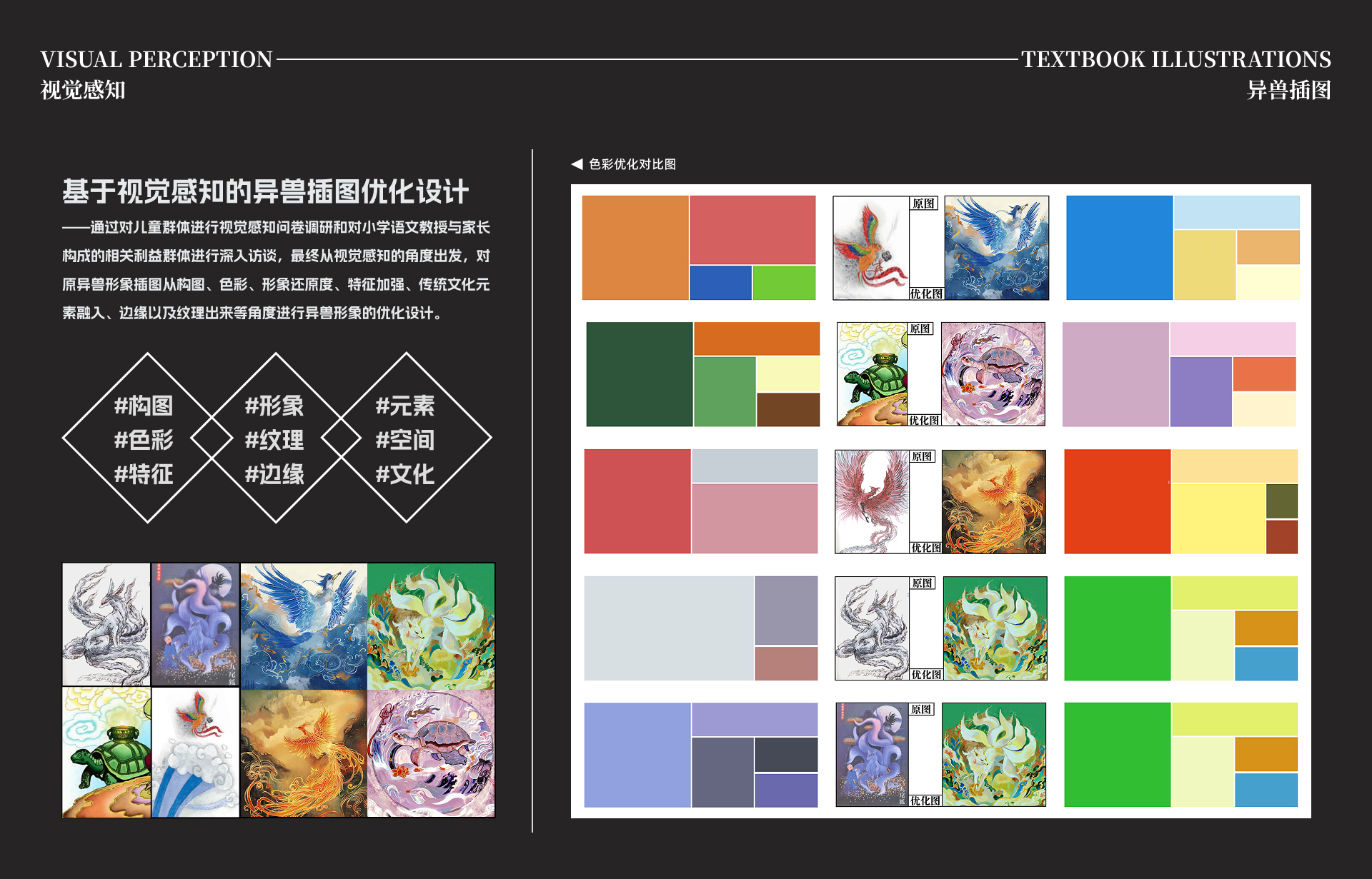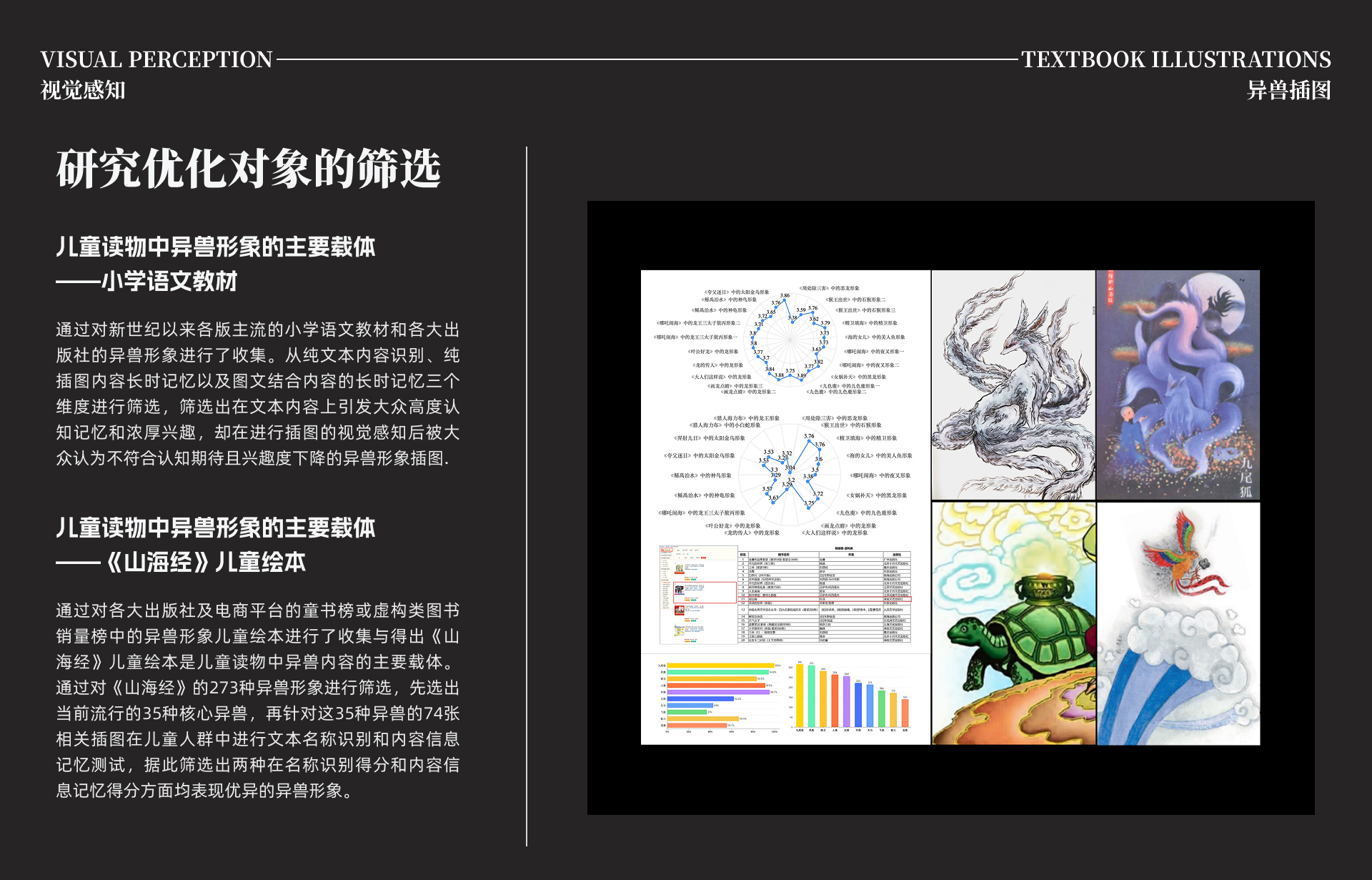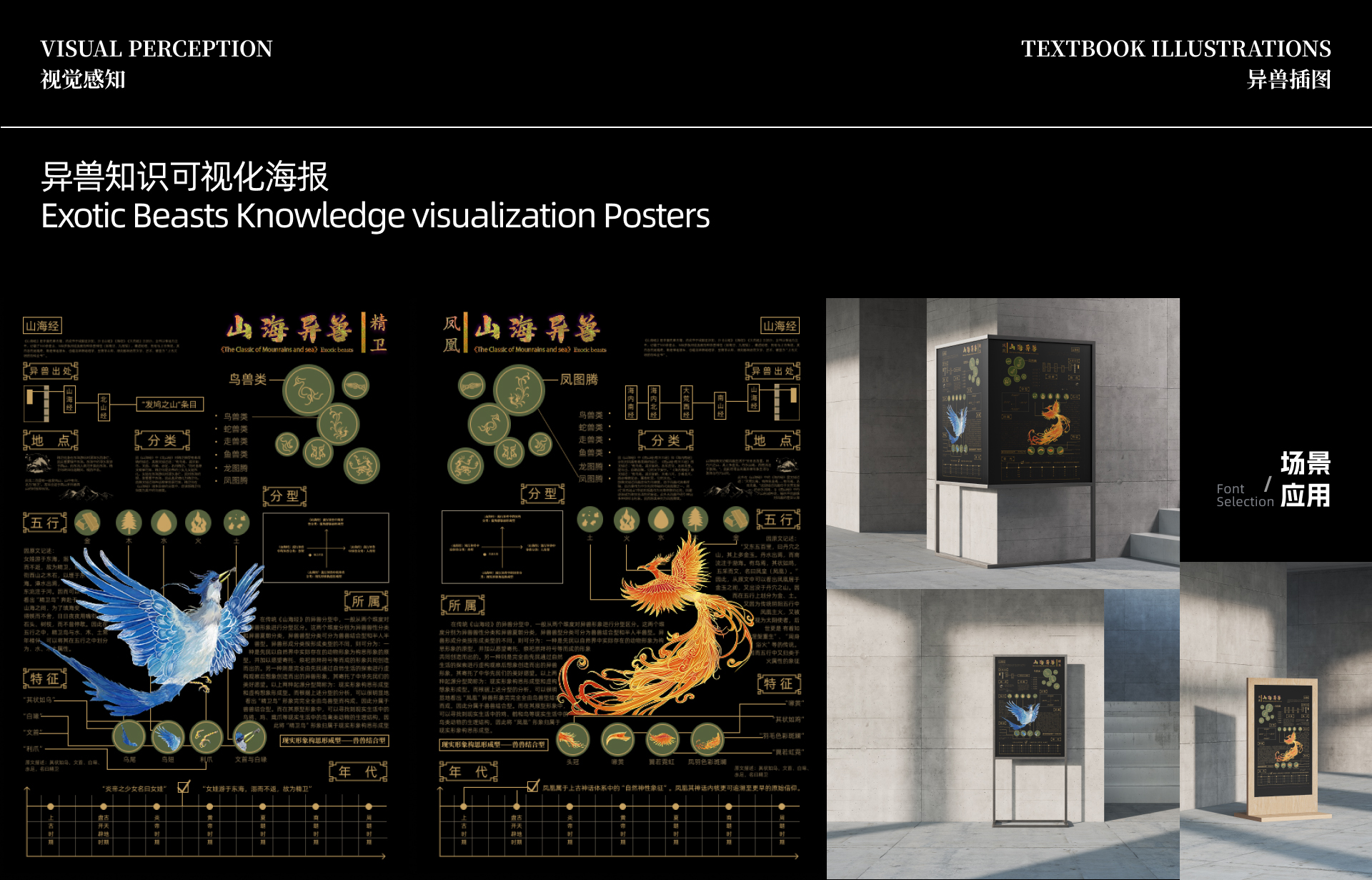 Exotic Beasts Visual Field” originates from people's visual perception preference, especially in childhood, and visual improvement is made through the preference. The improved visual appearance is then used to disseminate culture through static and dynamic, complex and simple, words and pictures, etc., and at the same time, it challenges the most efficient way of people's visual reception through various ways of visual impact. This work explores the best expression of visual image and visual culture communication between simplicity and complexity, comfort and excitement, and monotony and splendor in the visual world.