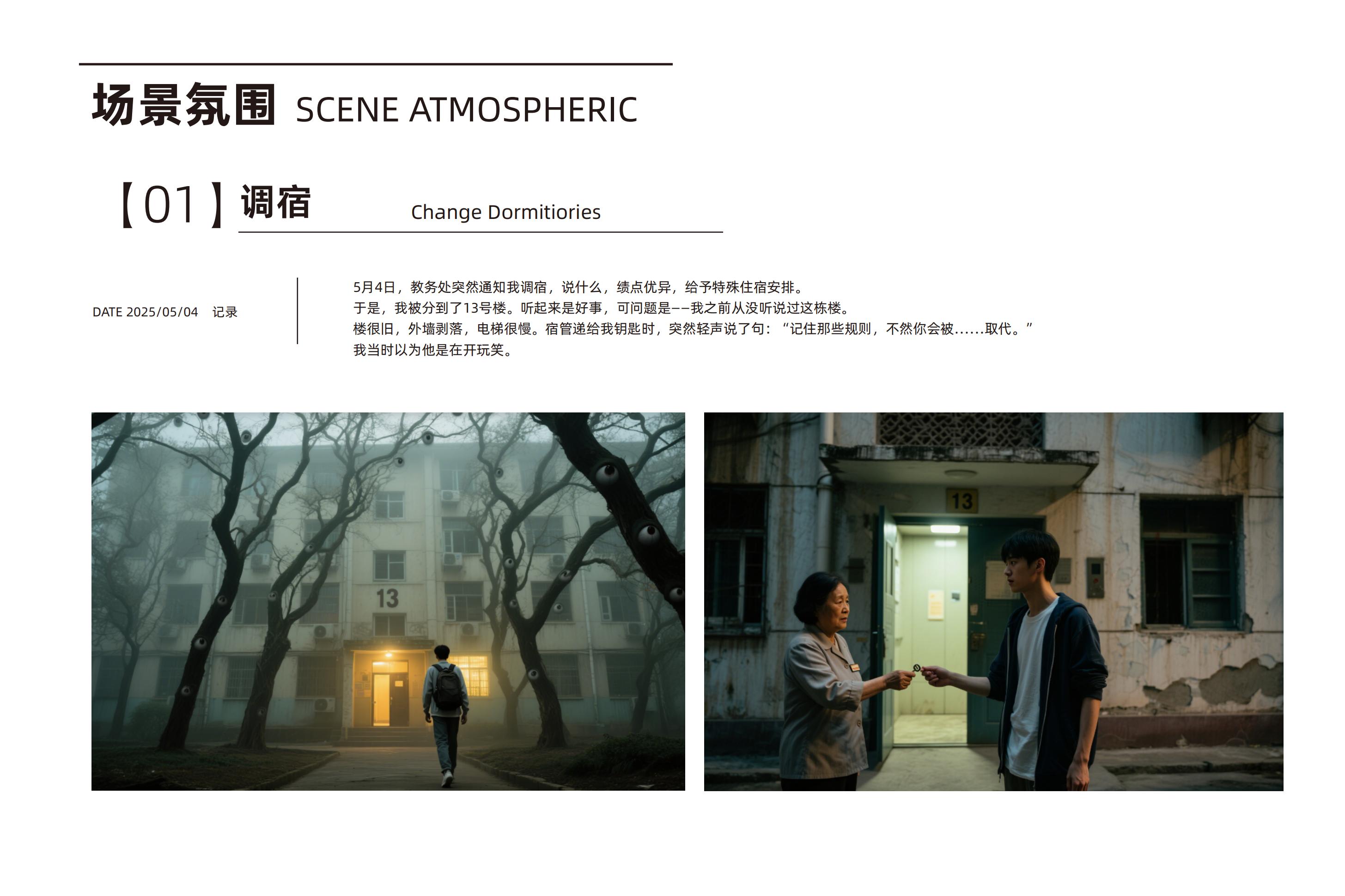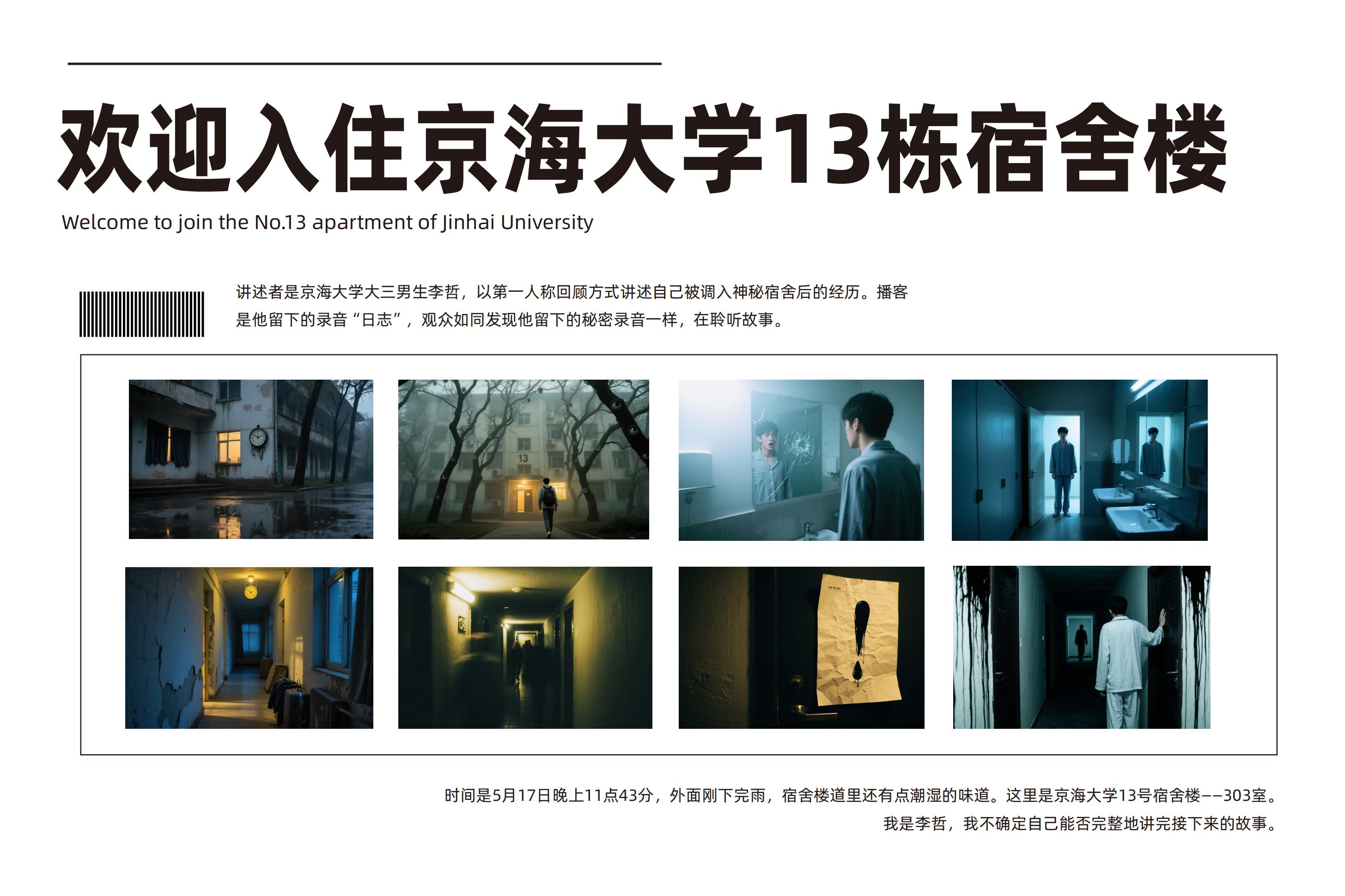 Podcast The Logbook of Building 13 is a first-person audio journal chronicling the eerie experiences of Li Zhe, a junior at Jinghai University who is mysteriously reassigned to an old dormitory. Behind the door hangs a yellowed sheet of paper filled with strange rules—and breaking them comes at a terrifying cost. As distorted faces, ominous knocking, and uncanny mirror reflections unfold, Li Zhe begins to uncover an unspeakable presence lurking within the dormitory…