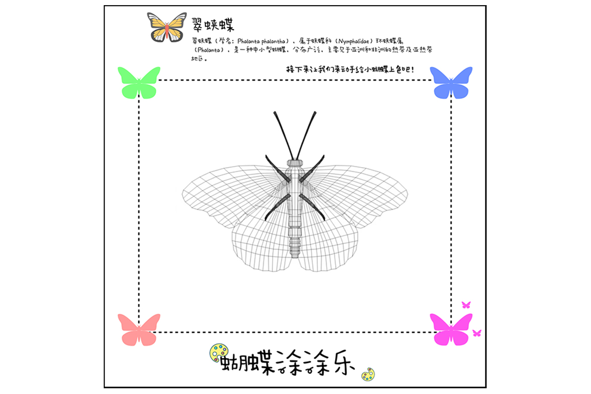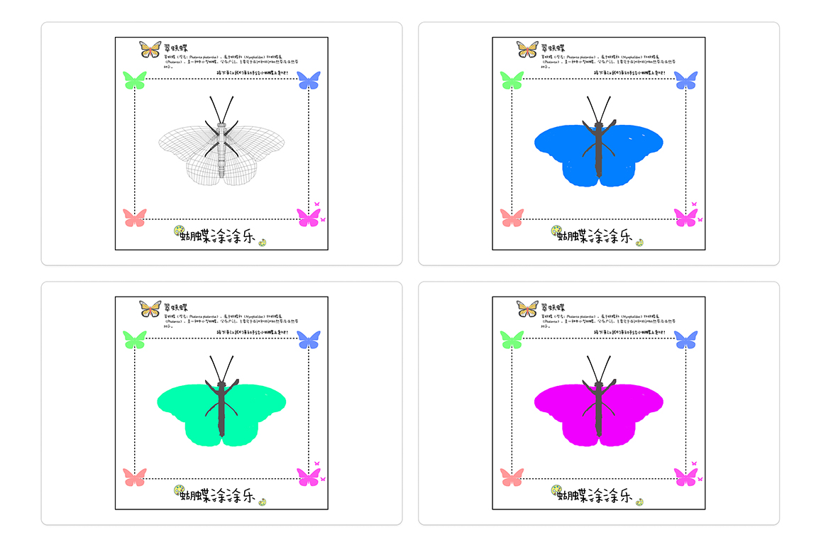本作品面向6-12岁儿童群体,应用于儿童博物馆以及常见的儿童美育场所。作品主要分为AR色彩融合与AR色彩涂鸦两个模块。儿童通过摄像头对AR识别卡进行扫描并完成色彩融合的尝试和学习,了解颜色之间的相互关系。同时,也可以使用画笔进行上色,并且把独特的二维绘画转化为生动形象的蝴蝶,将艺术和科技融合贯通。