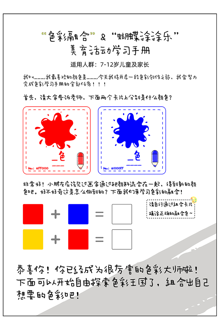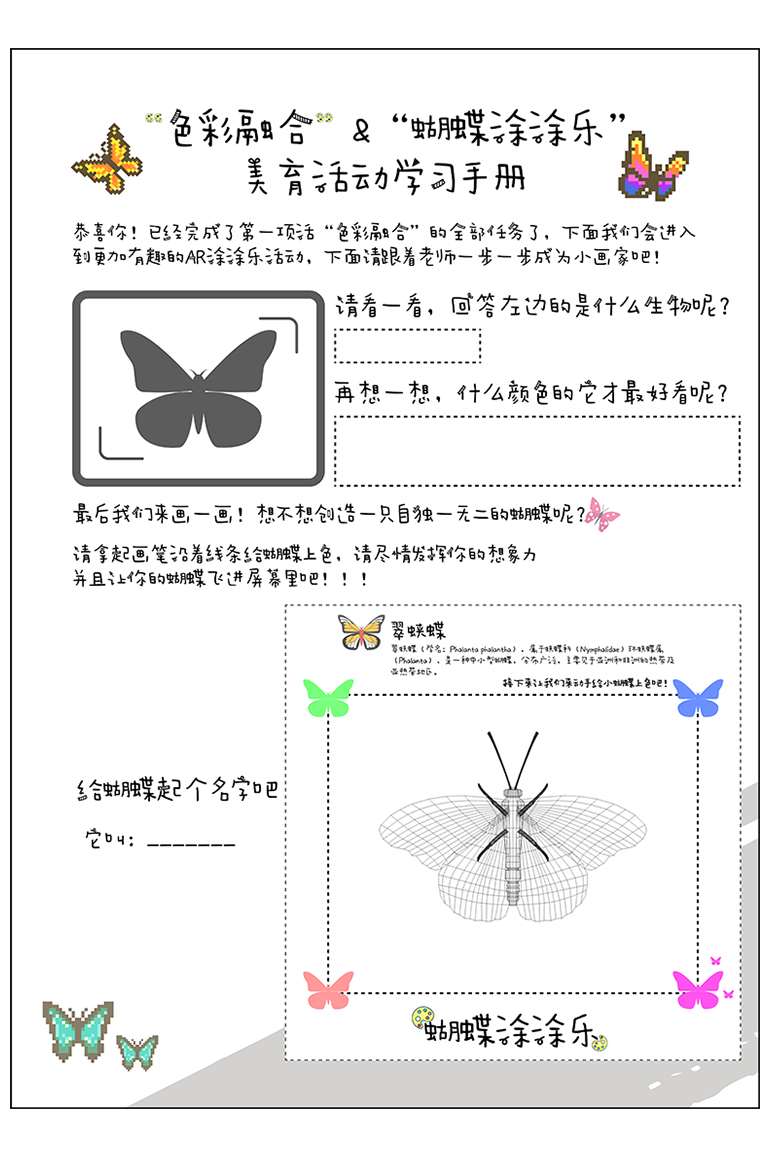 This project is designed for children aged 6 to 12 and can be used in children's museums and other common art education spaces. It includes two main modules: AR Color Fusion and AR Color Doodling. Children can scan AR recognition cards with a camera to explore and learn about color mixing and the relationships between colors. They can also use a brush to color and turn their unique 2D drawings into vivid butterflies, blending art with technology.