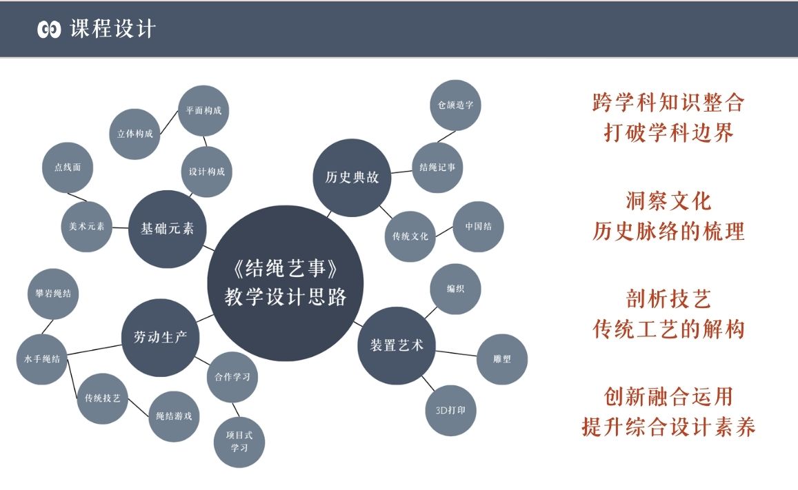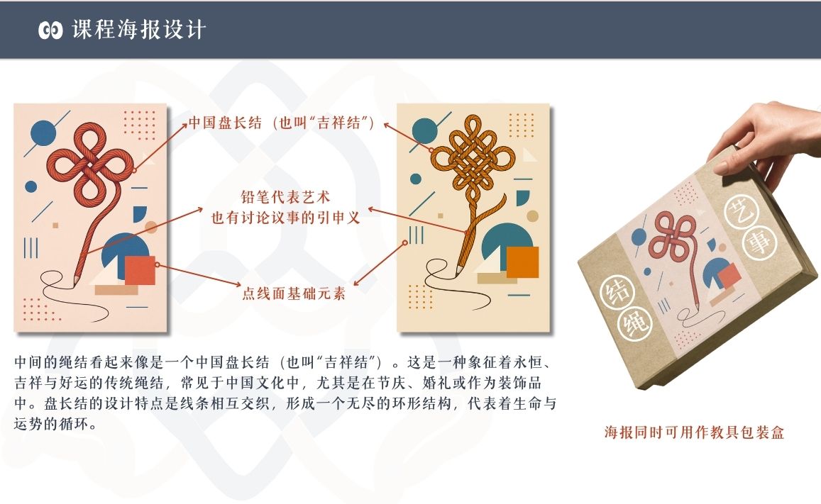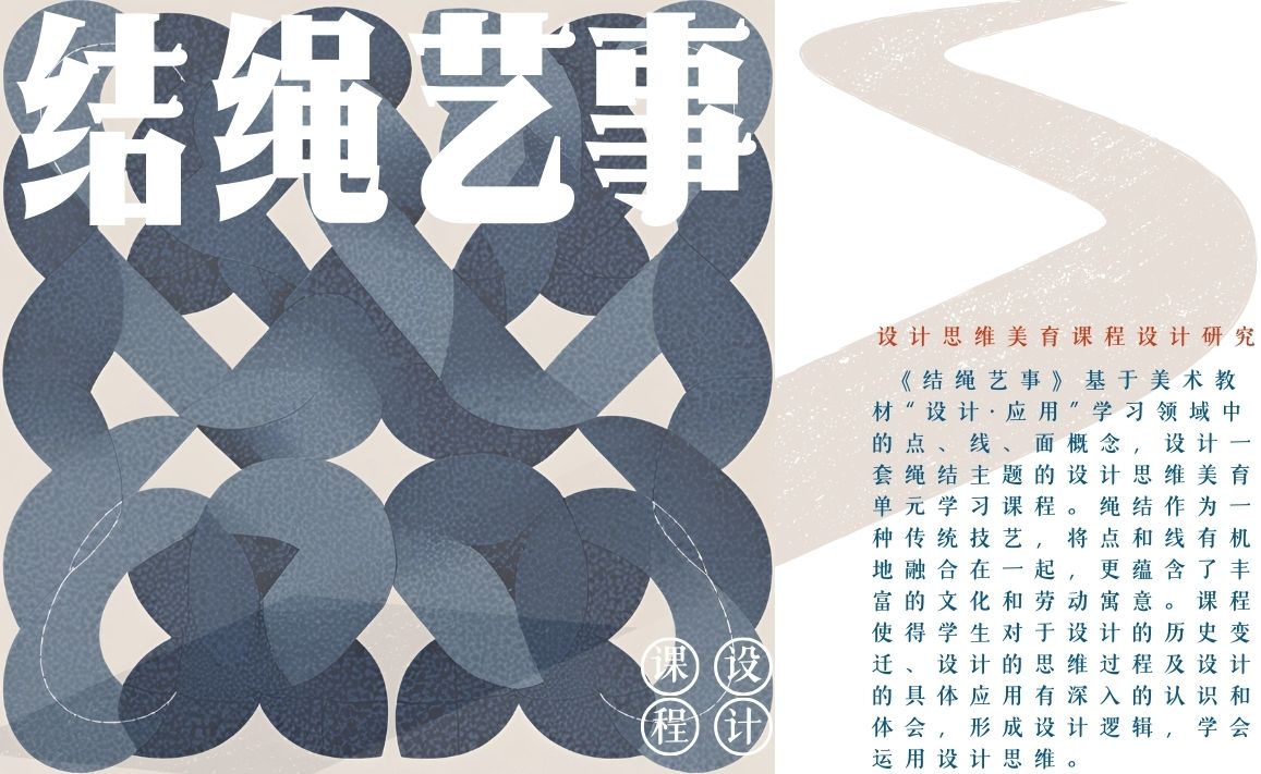 《结绳艺事》基于美术教材“设计·应用”学习领域中的点、线、面概念,设计一套绳结主题的设计思维美育单元学习课程。绳结作为一种传统技艺,将点和线有机地融合在一起,更蕴含了丰富的文化和劳动寓意。课程使得学生对于设计的历史变迁、设计的思维过程及设计的具体应用有深入的认识和体会,形成设计逻辑,学会运用设计思维。