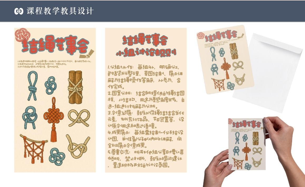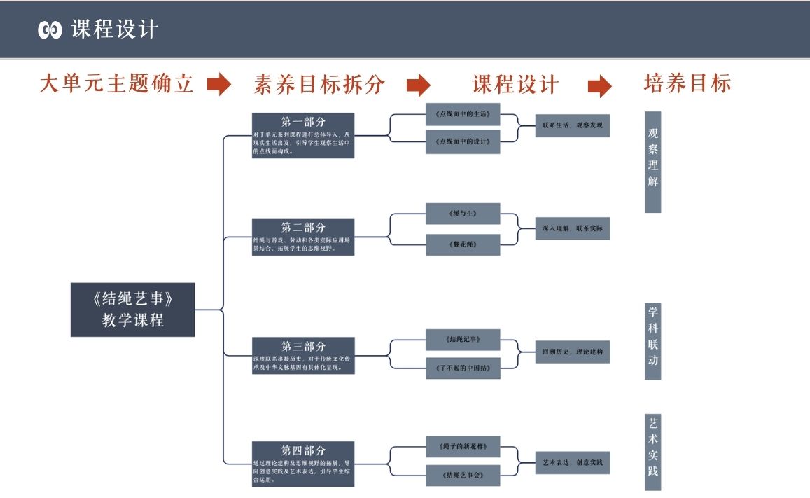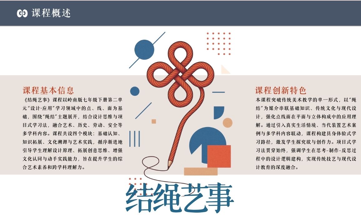 Knotting Art & Design is a thematic unit curriculum centered on design thinking and aesthetic education, rooted in the concepts of point, line, and plane from the "Design & Application" domain of art pedagogy. As a traditional craft, knotting organically integrates points and lines while embodying rich cultural and labor symbolism. The course enables students to deeply understand the historical evolution of design, the iterative design thinking process, and practical applications, fostering structured design logic and the ability to apply design thinking methodologies.